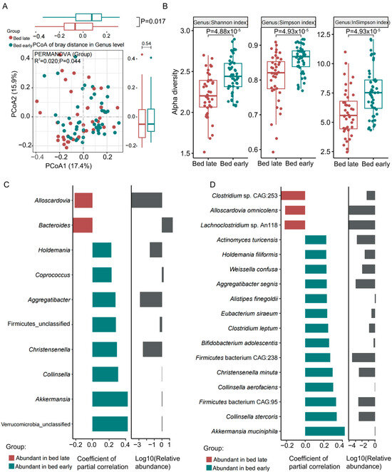 Microbial disorders in the gut of children in bed late and early. (A) PCoA showed significant differences of the gut microbiota at genus level. (B) The genus alpha diversity based on Shannon index, Simpson index and Inverse Simpson index was significantly different between bed late and early children. (C) Significantly different genera and (D) species associated with bed early and late. Grey in (C,D) refers to the logarithm of relative abundance of the corresponding genera and species, the smaller the value, the lower the relative abundance.