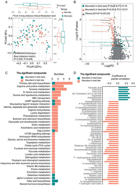 Differential analysis of the gut microbial metabolites between bed early and late children. (A) PCoA of the gut microbial metabolites were significantly different between two groups. (B) Volcano plot showed the differences of the metabolites, and 10 metabolites were significantly abundant in bed early children while 51 metabolites were obviously enriched in bed late children. (C) Enrichment of the KEGG pathways participated by the significantly different microbial metabolites in two groups. (D) The significantly different metabolites with KEGG pathway annotation for two groups.