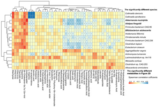 Correlation analysis between 17 significantly different species and 61 obviously distinct fecal metabolites were analyzed. Akkermansia muciniphila, Bifidobacterium adolescentis, Clostridium leptum, Eubacterium siraeum, Alistipes finegoldii, Holdemania filiformis were significantly positively associated with stachyose, FFA (14:0), FFA (12:0), traumatic acid, dopamine, 5b-Cholestane-3a,7a,12a-triol, and androstenediol, which were highly enriched in children with early bedtime, but were negatively correlated with metabolites highly abundant in children with late bedtime (Figure 3).