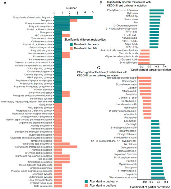 The gut microbial metabolites could be absorbed into blood to influence on host physiology; thus, we detected the plasma metabolites of children with early and with late bedtime. In total, 1538 plasma metabolites were detected and of those, 123 metabolites were significantly different between the two groups. Among children with early bedtime, 77 plasma metabolites were abundant, while 46 plasma metabolites were enriched in children with late bedtime. The KEGG pathways of different metabolites for children with early bedtime included biosynthesis of unsaturated fatty acids, fatty acid biosynthesis, linoleic acid metabolism, arachidonic acid metabolism, fatty acid degradation and elongation, PPAR signaling pathway, and regulation of lipolysis in adipocytes (Figure 4A). However, the metabolites enriched in children with late bedtime were mainly focused on amino acids metabolism, FoxO signaling pathway, primary bile acid biosynthesis, bile secretion, cholesterol metabolism, protein digestion and absorption, and GABAergic synapse and glutamatergic synapse (Figure 4A). Among children with early and with late bedtime, there were 13 and 5 significant metabolites with pathway annotations, and 18 and 13 other significant metabolites with database IDs (Figure 4B,C), respectively.