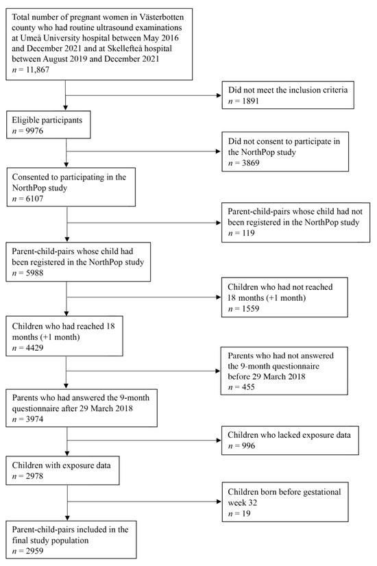 Between May 2016 and December 2021, 11,867 pregnant women had their routine ultrasound examinations within the NorthPop study catchment area, i.e., Västerbotten county. A flowchart for inclusion and exclusion of study participants is depicted in Figure 1. This study is reported in accordance with Strengthening the Reporting of Observational Studies in Epidemiology and nutrition (STROBE-Nut) guidelines for observational studies.