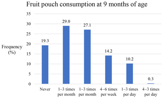 The 9-month FFQ showed that 19.3% of the 2959 children did not consume any fruit pouches, while 80.7% consumed fruit pouches ranging from rarely (one to three times per month) to very frequently (four to six times per day) (Figure 2).