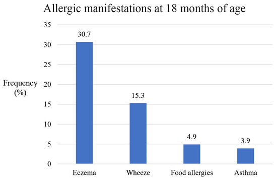 Allergic manifestations shown in valid percentages at 18 months of age. Eczema, asthma, and wheeze had 2648, 2649, and 2650 responses, respectively. For food allergies, there were a total of 2252 responses.