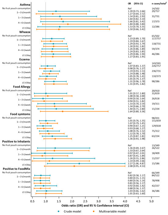Associations between fruit pouch consumption and allergic manifestations presented in a crude (blue) and a multivariable (orange) model. For each outcome, four categories of consumption are compared to the reference group that reported no fruit pouch consumption. 1 refers to the total number of participants in the crude model. n = number, t = times.