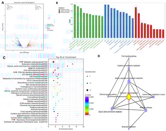 To further understand the biological functions of the DEGs affected by CP, a KEGG pathway enrichment analysis was performed on the significantly altered DEGs. In Figure 2C, CP mainly affected the “metabolic pathways”, “butanoate metabolism”, “glycine, serine, and threonine metabolism” on HepG2. Interestingly, most of the enriched TOP30 pathways were related to the cellular metabolism, such as the central carbon metabolism, amino acid metabolism, and glycolysis. The results of the KEGG analysis are consistent with those of the GO analysis. Moreover, glycolysis cross-talked several signaling pathways, such as “butanoate metabolism”, the “PI3K–AKT signaling pathway”, and the “FoxO signaling pathway” (Figure 2D). We previously found that propolis significantly downregulated the protein expression levels of the PI3K–AKT signaling pathway in HepG2 cells []. Therefore, the regulation of the HepG2 metabolic pathway, especially the glycolytic pathway, allowed CP to exert an anticancer effect.