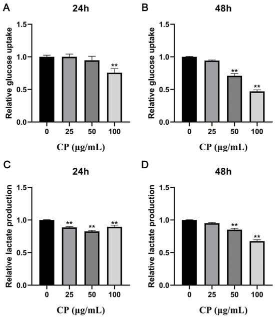 Generally, normal cells ingest glucose and undergo glycolysis under anaerobic conditions to produce lactate, but tumor cells also metabolize glucose under aerobic conditions via the glycolysis pathway, which is known as the Warburg effect. Therefore, we investigated the effects of CP treatment on glucose uptake and lactate production. As shown in Figure 3A,B, CP intervention significantly inhibited the glucose uptake (p < 0.01). In particular, 100 μg/mL CP treatment for 48 h could reduce glucose uptake by more than 50%. CP also reduced lactate production to varying degrees (p < 0.01) and maintained an inhibitory effect for 48 h (Figure 3C,D).