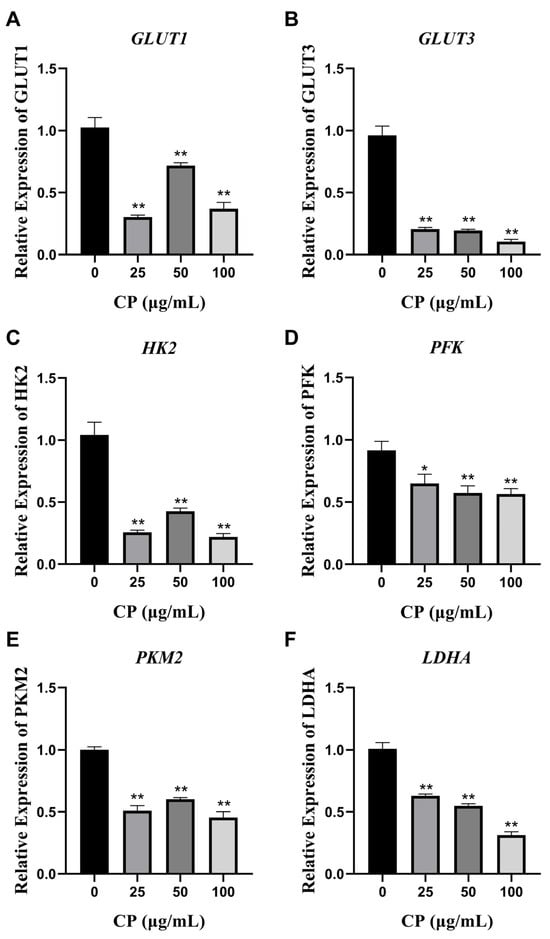 Gene expression analysis. Effects of CP on the mRNA expression of genes related to glucose transporters and glycolytic rate-limiting enzymes in HepG2 cells. Cells were treated with CP (25, 50, 100 μg/mL) for 36 h or 20 min. The mRNA levels of GLUT1 (A), GLUT3 (B), HK2 (C), PFK (D), PKM2 (E), and LDHA (F) were quantified using qRT-PCR and normalized to β-actin; the levels of gene expression in the control group were set to 1. The data shown represent means ± SEMs values from three independent experiments. Individual groups were compared using ANOVA (* p < 0.05, ** p < 0.01 compared with the control group, n = 3).