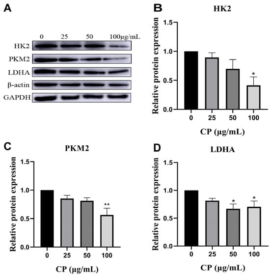 Extracellular glucose enters the cell via GLUTs and undergoes phosphorylation to form glucose-6-phosphate (G6P), initiating glycolysis. As shown in Figure 4C,E,F, CP treatment for 36 h significantly reduced the mRNA levels of essential glycolytic enzymes, such as HK2, PKM2, and LDHA. We also observed a significant inhibition of the protein expression levels of these three key enzymes following CP treatment (Figure 5A–D). Since the time of gene expression was unknown, no change in PFK gene expression was detected after CP treatment for 36 h; therefore, after a 20 min CP intervention, we detected PFK gene expression. CP treatment for 20 min significantly decreased the levels of PFK mRNA expression (Figure 4D).