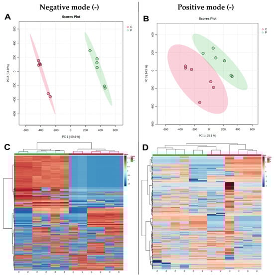 Multivariate statistical analyses of metabolites in HepG2 cells (PCA). (A,B) The PCA score plots in negative and positive modes, respectively. (C,D) Cluster heatmap analysis of metabolites at CP and control exposure. (E,F) Volcano plots of the metabolic in control and CP treatment groups. (C: control, P: Chinese poplar propolis).