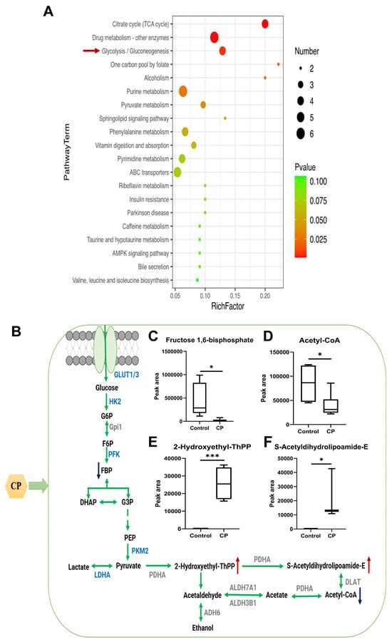 Based on the above criteria, the differential metabolites were screened and compared to the KEGG database to obtain metabolic pathway classification profiles (Figure 7A), and the three pathways with the highest enrichment were “citrate cycle (TCA cycle)”, “drug metabolism—other enzymes”, and “glycolysis/gluconeogenesis”. This indicates that the significant changes in the metabolites after CP treatment were highly correlated with glucose metabolism. In the glycolysis/gluconeogenesis metabolic pathway, the intermediate metabolites changed significantly after CP treatment, as shown in Figure 7B. The content of intermediate products, such as fructose 1,6-diphosphate (FBP) and acetyl-CoA, significantly decreased, and 2-hydroxyethyl-ThPP and S-acetyldihydrolipoamide-E levels were significantly upregulated (Figure 7C–F).