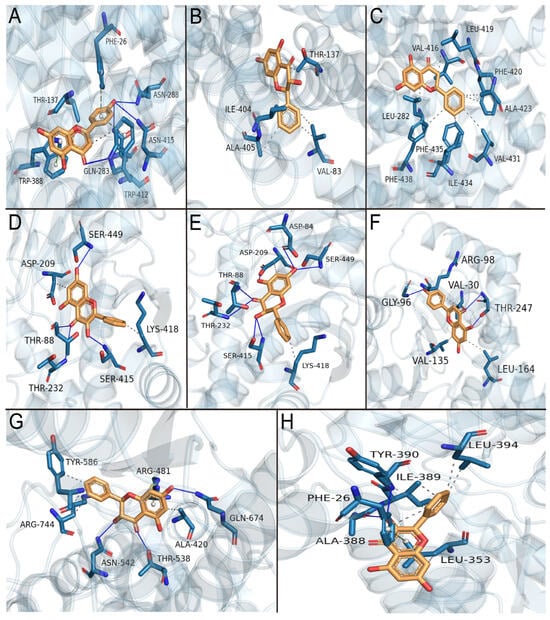 Combination of the active components of propolis and glycolysis key enzymes. The target protein structure is shown in blue and the brown represents the small-molecule ligand. (A) GLUT1–apigenin, (B) GLUT1–pinobanksin, (C) GLUT3–pinocembrin, (D) HK2–galangin, (E) HK2–pinobanksin, (F) LDHA–apigenin, (G) PFK–pinobanksin, and (H) PKM2–galangin. Blue line for hydrogen interactions, gray dashed line for hydrophobic interactions, light green dashed line for Π–Π stacking (P-type), dark green dashed line for Π–Π stacking (T-type).