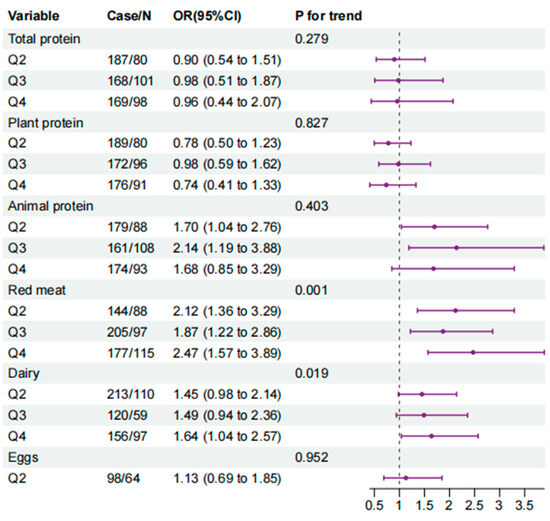 In logistic regression analyses, total dietary protein intake, animal protein intake, red meat intake and dairy products intake were significantly and positively associated with the odds of GDM in model one; the ORs (95% CI) were 1.52 (1.06, 2.19), 1.70 (1.17, 2.48), 2.35 (1.60, 3.46) and 1.64 (1.15, 2.33), respectively. Other sources of protein, including plant protein and eggs protein, were revealed to not be associated with the odds of GDM. However, in model two, when adjusted for age, pre-pregnancy BMI and family history of diabetes, physical activity, sleep quality, three eating habits, total calories, carbohydrate, total fat and cholesterol, only animal protein, red meat protein and dairy protein intake were significantly associated with the odds of GDM. Compared with the lowest quartile, the ORs (95% CI) for GDM of the second, third and highest quartile of the animal protein intake were 1.70 (1.04, 2.76), 2.14 (1.19, 3.88) and 1.68 (0.85, 3.29) (p for trend = 0.403), they were 2.12 (1.36, 3.29), 1.87 (1.22, 2.86) and 2.47 (1.57, 3.89) for the red meat protein intake (p for trend = 0.001) and they were 1.45 (0.98, 2.14), 1.49 (0.94, 2.36) and 1.64 (1.04, 2.57) for the dairy protein intake (p for trend = 0.019) (Figure 1).