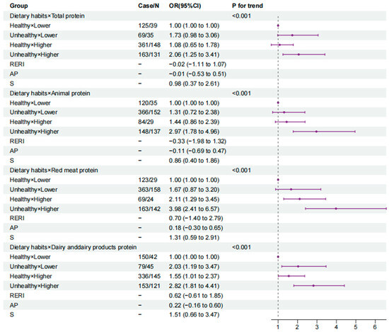 In the fully adjusted model, using the combination of healthy eating habits and low protein intake as a reference, for the total protein and animal protein, only the last combination (unhealthy eating habits and high protein intake) were associated with increased odds of GDM, and the ORs were 2.06 (1.25, 3.41) for total protein and 2.97 (1.78, 4.96) for animal protein. The additive interaction between a high total protein intake and unhealthy eating habits for GDM was insignificant (RERI: −0.02 (95% CI, −1.11 to 1.07)) and was also insignificant between a high animal protein intake and unhealthy eating habits for GDM (RERI: −0.33 (95% CI, −1.98 to 1.32)). For the red meat protein, a higher intake combined with eating habits, healthy (OR = 2.11, 95% CI = 1.29, 3.45) or not (OR = 3.98, 95% CI = 2.41, 6.57), was significantly associated with increased odds of GDM; however, a insignificant additive interaction was detected (RERI: 0.70 (95% CI, 1.40 to 2.79)). For dairy protein, all of the three other combinations were associated with significantly increased odds of GDM, with ORs (95% CI) of 2.03 (1.19, 3.47), 1.55 (1.01, 2.37) and 2.82 (1.81, 4.41), respectively. The p values for the trend were all significant (p < 0.001). However, no additive interaction was observed between dairy protein intake and eating habits regarding the odds of GDM (RERI: 0.62 (95% CI, −1.61 to 1.85)) (Figure 2).