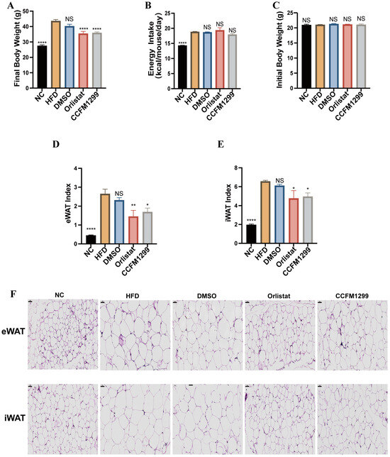 Effects of CCFM1299 and orlistat on body weight and adiposity: (A) body weight of each group in last week; (B) energy intake of each group; (C) initial body weight of each group; (D) eWAT index of mice in each group; (E) iWAT index of mice in each group; (F) representative histology of eWAT and iWAT (scale bars: 50 µm; magnification: 200×). Data are shown as means with standard error of the mean (SEM); NS was used to indicate that there was no significant difference with HFD group. *, **, and **** were used to indicate that the p values were less than 0.05, 0.01, and 0.0001, respectively, compared with the HFD group. One-way ANOVA followed by Dunnett’s test for multiple comparison was used for significance analysis.