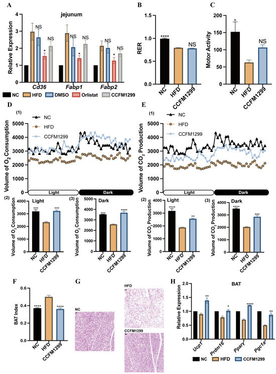 Effects of CCFM1299 on metabolism and the expression of thermogenesis-related genes in BAT: (A) the expression of Cd36, Fabp1, and Fabp2 in jejunum; (B) RER of mice in NC, HFD, and CCFM1299 groups; (C) motor activity of mice in NC, HFD, and CCFM1299 groups; (D), (1) the O2 consumption curve of mice in a day; (2) the O2 consumption of mice in daytime (light); (3) the O2 consumption of mice in the night (dark); (E), (1) the CO2 production curve of mice in a day; (2) the CO2 production of mice in daytime (light); (3) the CO2 production of mice in the night (dark); (F) BAT index of mice in NC, HFD, and CCFM1299 groups; (G) representative histology of BAT in mice in NC, HFD, and CCFM1299 groups (scale bars: 50 µm; magnification: 200×); (H) the expression of Ucp1, Prdm16, Pparγ, and Pgc1a in BAT. Data are shown as means with standard error of the mean (SEM); One-way ANOVA followed by Dunnett’s test for multiple comparison was used for the significance analysis in (A–F), and in (A) the significance analysis was only performed between HFD, DMSO, orlistat, and CCFM1299 groups. (A–F) NS was used to indicate that there was no significant difference with HFD group. *, **, ***, and **** were used to indicate that the p values were less than 0.05, 0.01, 0.001, and 0.0001, respectively, compared with the HFD group. Student’s t-test was used for the significance analysis in (H).
