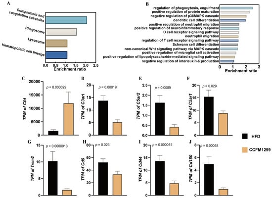 Effects of CCFM1299 on transcriptome of eWAT: (A) KEGG pathway enrichment analysis of DGs; (B) biological processes enriched via GO ontology; (C–J) TPM of differential genes involved in the enriched immune pathway.
