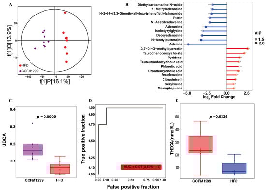 Effects of CCFM1299 on fecal and serum metabolites: (A) OPLS-DA of fecal metabolites between the HFD and CCFM1299 groups; (B) matchstick analysis of DMs between the CCFM1299 and HFD groups (the red matchstick indicated that the DMs were up-regulated in theCCFM1299 group, and the blue matchstick indicated that the DMs were downregulated in the CCFM1299 group); (C) the fecal level of UDCA showed in boxplot; (D) ROC of UDCA; (E) the serum concentration of THDCA. *, **, and ***were used to indicate that the p values were less than 0.05, 0.01, and 0.001, respectively.