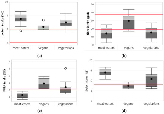 Boxplots represent 25th, 50th, and 75th percentiles of intake with whiskers at the < 1.5 interquartile range (IQR) per dietary pattern. Black dots represent mean intake and white dots outliers with >1.5 IQR: (a) protein; (b) fiber; (c) polyunsaturated fatty acids (PUFA); (d) saturated fatty acids (SAFA). Straight red lines represent the lower level of the acceptable macronutrient distribution range (AMDR) for protein (i.e., 5%E for children ≤ 3 y; 10%E for children > 3 y) and PUFA (i.e., 6%E) and the upper level of the AMDR for SAFA (i.e., 8%E). For fiber, the adequate intake (AI) for the age and gender groups with the lowest (19 g/d) and highest (38 g/d) dietary requirements that were included in the studies is shown. Boxplots are only shown for macronutrients, for which intake data from at least 3 studies were available for at least one of the dietary patterns.