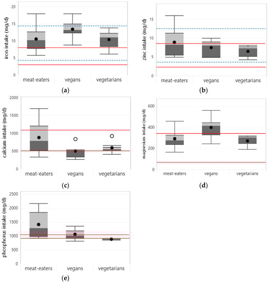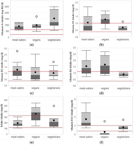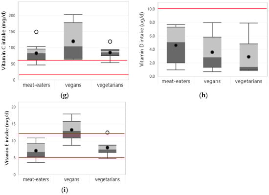 Boxplots represent 25th, 50th, and 75th percentiles of vitamin intakes from foods only, with whiskers at the <1.5 interquartile range (IQR). Black dots represent mean intake and white dots outliers at the >1.5 IQR: (a) vitamin A; (b) vitamin B1; (c) vitamin B2; (d) vitamin B6; (e) folate; (f) vitamin B12; (g) vitamin C; (h) vitamin D; (i) vitamin E. Straight red lines represent the estimated average requirement (EAR) for the age and gender groups with the lowest and highest dietary requirements that were included in the studies. Boxplots are only shown for nutrients, for which intake data from at least 3 studies were available for at least one of the dietary patterns.