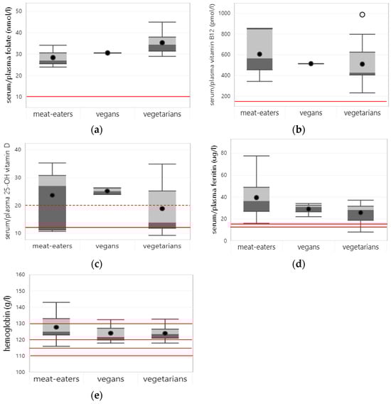 Boxplots represent 25th, 50th, and 75th percentiles of micronutrient status (a–d) and hemoglobin (e) concentrations per dietary pattern based on all studies (i.e., including and excluding supplement users) with whiskers at the <1.5 interquartile range (IQR). Black dots represent mean biomarker concentrations and white dots outliers at the > 1.5 IQR. Straight red lines represent cut-off levels to indicate nutrient deficiency and anemia, i.e., folate (<10 nmol/L), vitamin B12 (<148 pmol/L), vitamin D (<12 µg/L), and ferritin (<12 µg/L for children < 5 y; <15 µg/L for older children). For anemia, cut-off values were 110 g/L for children < 6–59 months, 115 g/L for children 5–11 y, 120 g/L for children 12–14 y and girls 15 y and older, and 130 g/L for boys 15 y and older. The dotted red line represents the cut-off value for vitamin D insufficiency (<20 µg/L). Boxplots are only shown for nutrients, for which status data from at least 3 studies were available for at least one of the dietary patterns.