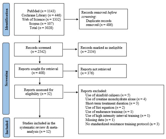 In the initial literature search, 3028 publications were found. Of these, 486 duplicate publications were eliminated, leaving 2542 distinct publications, from which 2134 were deemed ineligible based on titles and abstracts, and another 376 publications were not retrieved due to irrelevant study designs and outcomes of interest. In total, 32 RCTs investigating the effects of creatine monohydrate on body fat in adults aged < 50 years were found. After further examination of the remaining publications, five of these used skinfold calipers for the measurement of body fat, four used creatine monohydrate in the absence of resistance training, three had a short-term treatment duration (<4 weeks), two used the Siri equation to quantify body fat, one had inadequate data, one used endurance training, one used high-intensity interval training, and three did not have a standardized resistance training protocol. Overall, 12 RCTs were included in this systematic review and meta-analysis (Figure 1), involving 266 participants (130 in the creatine monohydrate and resistance exercise group and 133 in the placebo and resistance exercise group). A detailed description of the included studies is depicted in Table 1.