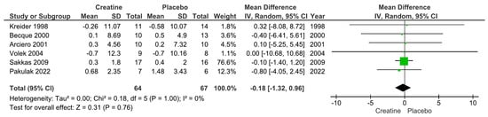 The subgroup analysis based on age (<40 years vs. 41–49 years) showed that creatine supplementation did not influence fat mass more than placebo (<40 years: SMD = −0.18; 95% CI, −0.44 to 0.08; I2 = 0%; p = 0.18 vs. 41–49 years: SMD = −0.05; 95% CI, −0.73 to 0.63; p = 0.88) (Figure S1). Similar results were found with regards to the fat mass assessment tool (DXA: SMD = −0.13; 95% CI, −0.46 to 0.20; I2 = 0%; p = 0.44 vs. BIA: SMD = −0.27; 95% CI, −0.99 to 0.45; p = 0.47 vs. hydrodensitometry: SMD = −0.17; 95% CI, −0.62 to 0.29; I2 = 0%; p = 0.47 vs. Bod Pod: SMD = −0.26; 95% CI, −1.35 to 0.84; p = 0.65) (Figure S2), BMI (<25 kg/m2: SMD = −0.14; 95% CI, −0.45 to 0.16; I2 = 0%; p = 0.36 vs. ≥25 kg/m2: SMD = −0.20; 95% CI, −0.61 to 0.22; I2 = 6%; p = 0.35) (Figure S3), sex (Females only: SMD = 0.08; 95% CI, −0.69 to 0.85; p = 0.84 vs. Males only: SMD = −0.19; 95% CI, −0.45 to 0.08; I2 = 0%; p = 0.17 vs. Mixed: SMD = −0.26; 95% CI, −1.35 to 0.84; p = 0.65) (Figure S4), creatine dose (<5 g: SMD = −0.12; 95% CI, −0.43 to 0.18; I2 = 0%; p = 0.43 vs. ≥5 g: SMD = −0.24; 95% CI, −0.65 to 0.17; I2 = 2%; p = 0.26) (Figure S5) and duration of supplementation (<8 weeks: SMD = −0.08; 95% CI, −0.41 to 0.25; I2 = 0%; p = 0.63 vs. ≥8 weeks: SMD = −0.28; 95% CI, −0.69 to 0.13; I2 = 20%; p = 0.18) (Figure S6), and resistance exercise frequency (≤3x/week: SMD = −0.07; 95% CI, −0.41 to 0.26; I2 = 0%; p = 0.67 vs. >3x/week: SMD = −0.27; 95% CI, −0.63 to 0.09; I2= 2%; p = 0.14) (Figure S7).