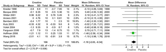 Our main analysis showed that creatine supplementation did not significantly impact changes in absolute fat mass (kg) over time (k = 6; MD = −0.18; 95%CI, −1.32 to 0.96; I2 = 0%; p = 0.76) (Figure 2). However, creatine did produce a significant reduction in body fat percentage over time (k = 10; MD = −1.19; 95% CI, −2.03 to −0.34; I2 = 0%; p = 0.006) (Figure 3).