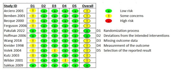 Four of the studies were classified as having a low risk of bias [16,17,19,21], six studies had a moderate risk [13,18,22,23,24,27], and two studies had a high risk of bias [14,20]. These concerns primarily arose due to the absence of specific details regarding randomization procedures or treatment allocation, considering that two studies did not report whether the participants were randomized [14,20]. Lastly, in one study, the supplement was provided in a single-blind fashion [24]. A detailed description of the risk of bias assessment is depicted in Figure 4.