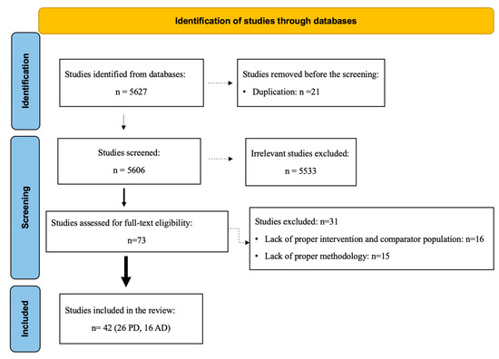 Through the initial database search, a total of 5627 articles were identified. After removing duplicate records (n = 21), 5606 unique records remained. Following the title and abstract screening, 5533 records were identified as irrelevant. The remaining 73 records underwent full-text screening to determine eligibility. Among these, 31 studies were excluded due to the absence of appropriate case and control groups (n = 16) or inappropriate methodology (such as culture-based or targeted PCR studies) (n = 15). Ultimately, a total of 42 eligible studies (26 focused on Parkinson’s disease and 16 on Alzheimer’s disease) were included in this review (Figure 1).
