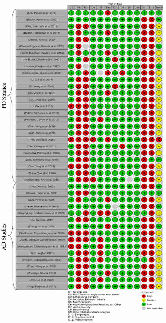 Of the articles, nine studies had the least risk of bias (five PD studies and four AD studies) [17,22,26,38,39,40,41,42,43], thirty-two studies had a medium risk (twenty PD studies and twelve AD studies) [14,18,19,20,21,23,24,25,27,28,44,45,46,47,48,49,50,51,52,53,54,55,56,57,58,59,60,61,62,63,64,65], and one PD study had a high risk [66] (Figure 2). A lack of appropriate experimental controls was observed in 39 studies for positive control [14,17,18,19,20,21,22,23,24,25,27,28,39,40,41,42,44,45,46,47,49,50,51,52,53,54,55,56,57,58,59,60,61,62,63,64,65,66] and in 38 studies for negative control [14,17,18,19,20,21,22,23,24,25,27,28,39,40,41,42,43,44,45,47,48,49,50,51,52,53,54,55,56,57,58,59,60,62,63,64,65,66]. Furthermore, 34 studies mainly recruited participants from a single center [18,19,20,21,22,23,25,26,27,28,41,43,44,45,47,48,49,50,51,52,53,54,55,56,57,58,59,60,61,62,63,64,65,66], and 31 studies did not employ a longitudinal sampling method [14,18,21,23,24,25,26,27,28,43,44,46,47,48,49,50,51,52,53,54,55,56,57,59,60,61,62,63,64,65,66]. In 10 studies, the microbial composition was reported as “Other” without providing specific details [14,19,20,27,38,42,45,46,51,65,66]. Additionally, seven studies did not adequately address matching factors between the cases and the controls [18,46,51,58,59,61,64]. Also, the sample size was small in six studies (n < 49) [18,48,54,58,60,66]. Two studies did not specify their inclusion/exclusion criteria [25,66], while another two studies did not assess alpha [21,24] and beta diversity comparison [14,55], respectively (Supplementary Material S3).