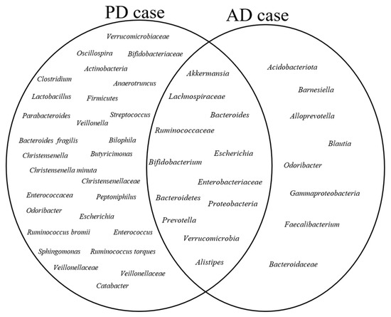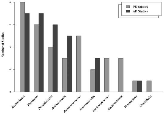 As a result, both the PD and the AD studies consistently identified the phyla Bacteroidetes, Firmicutes, and Proteobacteria as prevalent in the gut microbiota in both the healthy and the case groups (Figure 3).