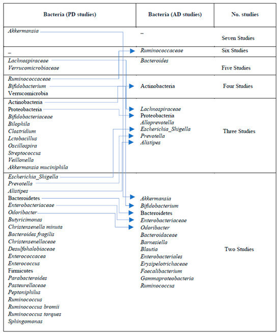 Other microbial communities reported in a lower number of studies in the AD and PD cases are shown in Figure 4.