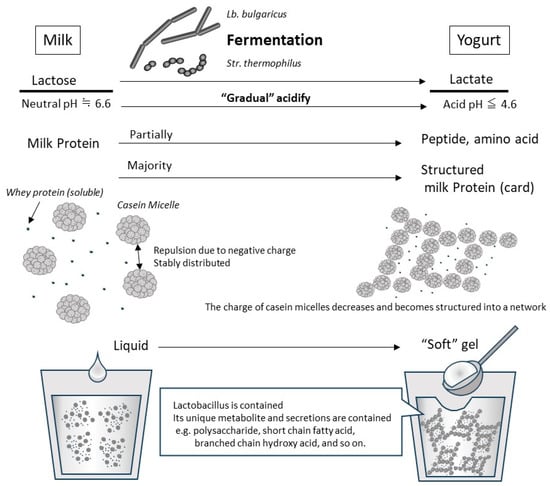 Typical changes due to lactobacillus fermentation at yogurt production from milk. An illustration of the changes during the production of “set yogurt”, which is produced by the most basic method of static fermentation. When the original milk is inoculated with Lb. bulgaricus and Str. thermophilus, they grow using lactose as a carbon source. In the process, lactose is converted to lactic acid, which decreases pH gradually. In fresh milk whose pH is neutral, casein micelles are negatively charged and are stably dispersed in the liquid due to their repulsion. As the fermentation progresses and the pH drops below 5.2, the casein micelles lose their charge and coagulate with each other. However, because this acidification and aggregation occurs slowly, casein micelles become a network structure that includes whey protein and water, so they are set as a soft gel (called card). By adding steps such as shearing and draining during or after fermentation, it is possible to create yogurt with different physical properties.