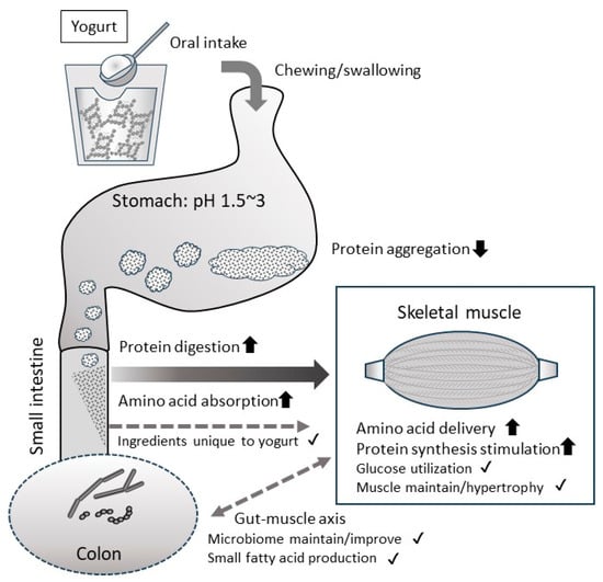 Studies investigating the relationship between intestinal microbiota and muscle mass have reported that several lactic acid bacteria are correlated with muscle mass []. In a recent review, Marco Castro et al. indicate that age-related abnormalities in the intestinal microbiota and/or increased intestinal permeability may lead to sarcopenia via chronic inflammation and decreased protein digestion []. In general, it has been suggested that chronic inflammatory conditions due to aging, obesity, and chronic disease can induce resistance to anabolic stimuli, including insulin resistance, leading to sarcopenia []. After yogurt consumption, anti-inflammatory effects may be exerted via lactobacillus metabolites and products.
