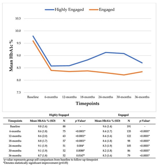 High-risk patients with diabetes (baseline HbA1c > 8%) at the Providence Community TK reduced their HbA1c by 1.2% from baseline to 6 months for both the Highly Engaged [9.8% (SD: 1.6) to 8.6% (SD: 1.8), p < 0.0001] and Engaged groups [9.6% (SD: 1.4) to 8.4% (SD: 1.7), p < 0.0001], and both groups sustained significant reductions at 12, 18, 24, 30, and 36 months (Figure 1).