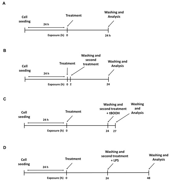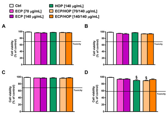 The cytotoxicity of the treatments with ECP and HOP extracts (70 and/or 140 µg/mL) alone and their mixtures (i.e., ECP/HOP 70/140 µg/mL and 140/140 µg/mL) was evaluated under two different treatment protocols. In the first one, the cells were treated for 24 h (Figure 1A), while in the second one, they underwent two repeated exposures: a first exposure of 2 h followed by a second 24 h exposure (Figure 1B). The last protocol mimics the cell exposure in the antiviral assays. The antioxidant, cytoprotective activity was assessed by treating the cells with the tested samples for 24 h and then with a subtoxic concentration of the pro-oxidant agent tert-butyl hydroperoxide (tBOOH; 500 µM) for 3 h (Figure 1C). At last, the immunomodulatory properties were evaluated by treating macrophages with the tested extracts and their mixtures for 24 h and then with E. coli 0111:B4 lipopolysaccharide (LPS; 2 µg/mL) for another 24 h (Figure 1D).