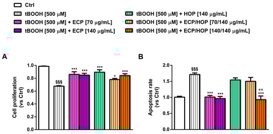 Effect of ECP (70 and 140 µg/mL), HOP (140 µg/mL) and their mixtures (70/140 and 140/140 µg/mL) on cell proliferation (A) and apoptosis rate (B) impaired by tert-butyl hydroperoxide (tBOOH) in murine macrophages RAW 264.7. Cells were pre-treated (24 h) and co-treated with tBOOH (3 h). Data are reported as the mean ± SEM (n = 9). §§§ p < 0.001, significant difference with respect to Ctrl. * p < 0.05 and *** p < 0.001, significant difference with respect to tBOOH. °° p < 0.01, significant difference in the ECP/HOP mixture with respect to HOP extract. Statistical analysis performed using ANOVA followed by Dunnett’s Multiple Comparison Post-Test.