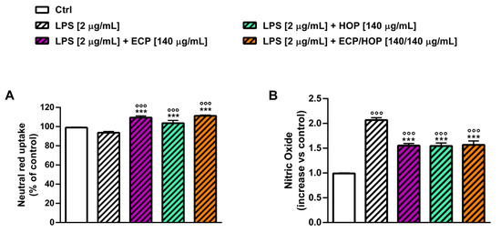 Effect of ECP (70 and 140 µg/mL), HOP (140 µg/mL) and their mixtures (70/140 and 140/140 µg/mL) on neutral red uptake (A) and nitric oxide release (B) in murine macrophages RAW 264.7 after lipopolysaccharide (LPS) exposure. Cells were pre-treated (24 h) and stimulated with LPS (24 h). Data are reported as the mean ± SEM (n = 9). °°° p < 0.001, significant difference with respect to Ctrl. *** p < 0.001, significant difference with respect to LPS. Statistical analysis performed using ANOVA followed by Dunnett’s Multiple Comparison Post-Test.