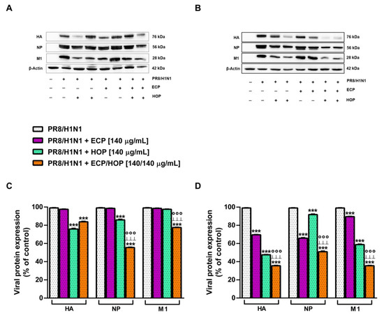 Effect of ECP (140 µg/mL), HOP (140 µg/mL) and their mixture (140/140 µg/mL) on the expression of viral proteins hemagglutinin (HA), nucleoprotein (NP) and matrix protein (M1) in bronchial epithelial BEAS-2B cells and lung adenocarcinoma A549 cells. Cells were treated before the infection (1 h), during the infection with influenza virus PR8/H1N1 strain (1 h) and after the infection (24 h). (A,B) Representative Western blotting membranes displaying the viral proteins and β -actin (protein loading control) in BEAS-2B and A549 cells, respectively. (C,D). Bar graphs of the viral protein densitometric analysis in BEAS-2B and A549 cells, respectively (data expressed as mean ± standard error obtained from at least three independent experiments). *** p < 0.001, significant difference with respect to the infected control. °°° p < 0.001, significant difference in the ECP/HOP mixture with respect to HOP extract. ꞱꞱꞱ p < 0.001, significant difference in the ECP/HOP mixture with respect to ECP extract. Statistical analysis performed using ANOVA followed by Dunnett’s Multiple Comparison Post-Test.