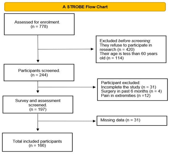 The total number of initially identified participants was n = 778. Participants excluded before screening were based on two criteria: older adults who refused to participate in the study (n = 420) and people less than 60 years old (n = 114). A total of 244 older adults were screened. After the screening, 31 participants who refused to complete the study, 4 participants who had surgery within the previous six months, and 12 participants who had pain in their extremities were excluded. In addition, 31 participants were excluded from the analysis due to missing data. Thus, 166 participants were finally enrolled in the present study, as shown in the STROBE flow chart (Figure 1).