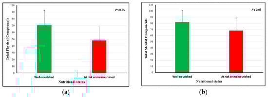 The HR-QoL of older adults according to their nutritional status showed that participants categorized in the at risk of malnutrition or malnourished group had significantly lower scores of total HR-QoL (56.21 ± 14.29 vs. 73.70 ± 17.35; p = 0.001). Additionally, physical and mental components were significantly higher in the well-nourished group compared to the at risk of malnutrition or malnourished group, as shown in Figure 2. There was a positive correlation between the MNA-SF score and all components of HR-QoL (Table 4). The correlation was statistically significantly associated with total physical components (r = 0.35), total mental components (r = 0.33), and total HR-QoL scores (r = 0.40), indicating a moderate correlation with the MNA-SF.