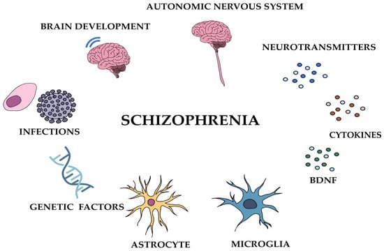 Schizophrenia is a severe psychiatric condition that results in a combination of hallucinations, delusions, and profoundly chaotic cognitive processes and behavior [1]. Schizophrenia is a multifactorial disease; its etiology involves a combination of genetic factors, as well as experiences of adversity, infection, and interactions between environmental and genetic influences [2,3,4,5,6,7] (Figure 1). The quantity of individuals diagnosed with schizophrenia witnessed a 65% surge in 2019 compared to the figures from 1990 [8]. Notably, there exists compelling evidence that 85% of individuals diagnosed with schizophrenia experienced childhood trauma [9].