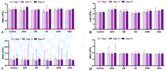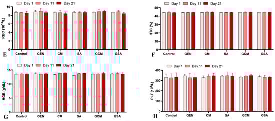 Hematological Profile. (A) White blood cells. (B) Lymphocytes. (C) Monocytes. (D) Neutrophils. (E) Red blood cells. (F) Hematocrit. (G) Hemoglobin. (H) Platelets. Statistics performed utilizing one-way ANOVA and two-way ANOVA; p > 0.05. The findings indicate mean ± SD of triplicate measurements.