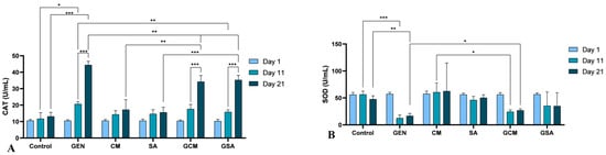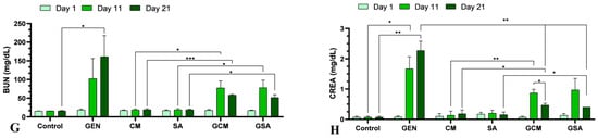 Blood urea nitrogen (BUN) was determined to have risen significantly in the gentamicin-treated experimental animals compared to the saline-treated rats on the last day of the experiment (161.24 ± 56.44 vs. 15.64 ± 1.33 mg/dL, p < 0.05). The BUN increase in the gentamicin-exposed group could be attributed to both renal and hepatic impairment, or dehydration. Furthermore, no significant differences were registered between the groups treated with extract and antibiotic and the group treated with antibiotic alone (p > 0.05). Contrarily, significant increases in BUN levels were registered in the GCM group compared to the CM group on day 11 (77.4 ± 8.67 vs. 18.56 ± 2.33 mg/dL, p < 0.05), as well as on day 21 (58.14 ± 2.21 vs. 19.07 ± 2.64 mg/dL, p < 0.001). Similarly to the GCM group, the GSA group exhibited significantly higher BUN levels than the SA group both on day 11 (77.96 ± 20.19 vs. 18.95 ± 2.80 mg/dL, p < 0.05) and day 21 (51.61 ± 7.87 vs. 18.76 ± 2.0 mg/dL, p < 0.05). Figure 3G shows these results graphically.