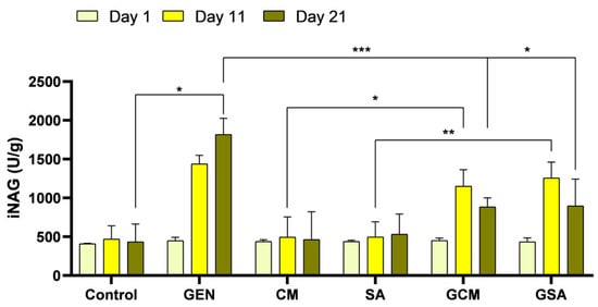 NAG represents a lysosomal enzyme that is located primarily in the renal proximal tubular cells. NAG cannot be filtered via the typical glomerular basal membrane due to its high molecular weight. As its increase implies the damage of tubular cells, it serves as an accurate diagnostic for estimating tubular injury. Because the urinary NAG/creatinine ratio exhibits fewer fluctuations linked to urine volume or excretion rate than NAG levels alone, it is commonly presented in ratio to the urinary creatinine as urinary NAG index (iNAG) activity [,]. In our study, gentamicin therapy resulted in large increases in iNAG activity, while Cornus mas L. and Sorbus aucuparia L. extract treatment drastically decreased its activity levels, outlining the protective effect against gentamicin’s harmful effects. Because the effects of these extracts on iNAG activity in an experimental model of nephrotoxicity had not previously been studied, our findings were compared to those of other investigated components. Thus, Codea et al. [] reported rises in iNAG activity in gentamicin-treated rats, whereas the administration of melatonin and erythropoietin prevented this aspect. Another study demonstrated the nephroprotective effect of Ginkgo biloba extract by determining significant reductions in iNAG levels in rats exposed to vancomycin-induced kidney damage []. Therefore, our results are in accordance with these previous publications, with Cornus mas L. and Sorbus aucuparia L. extracts manifesting a protective effect at the renal tubular level.