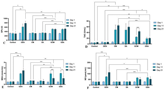 As such, total proteins were significantly increased in the GEN group compared to the Control group on the 11th day of the experiment (7.77 ± 0.42 vs. 6.57 ± 0.15 g/dL, p < 0.05). Improvements in total proteins were observed in rats treated with extracts and the antibiotic, as they were significantly reduced compared to the individuals treated with the antibiotic alone (p < 0.05). Moreover, the PT levels showed similarity to those of the extract-treated groups (p > 0.05). As for albumin, globulin, and glucose levels, no significant changes were recorded, being within the reference ranges []. These outcomes can be followed graphically in Figure 3A–D.