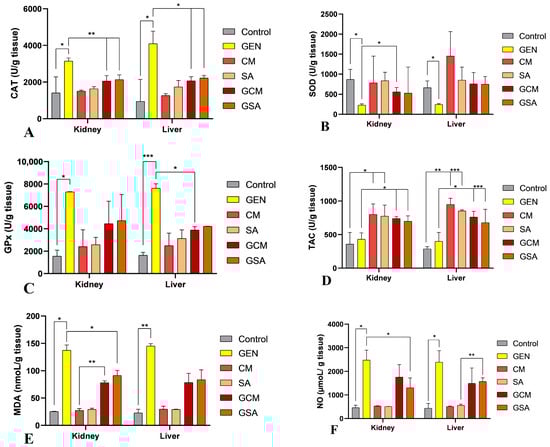 In terms of the results of antioxidant enzymes, a variety of changes were noticed. Thus, catalase levels were greatly increased after receiving gentamicin therapy, whereas treatment with the two extracts significantly decreased its activity. Additionally, both extracts indicated a stronger antioxidant impact at the tissue level than in plasma. SOD activity drastically decreased after receiving gentamicin treatment. Its activity was significantly increased after treatment with Cornus mas L. extract, and insignificantly elevated following Sorbus aucuparia L. extract administration. Moreover, plasma-level GPx activity was seen to increase in the gentamicin-treated rats before considerably declining following antioxidant treatment. When compared to plasma, the enzyme activity at the tissue level was shown to be lower, yet manifested a stronger antioxidant activity in liver tissue. Further, the groups treated with antioxidants alone demonstrated the greatest increases in plasma TAC activity. The antibiotic-plus-extracts groups demonstrated an improvement in antioxidant capacity, but they still differed significantly from the extracts-only batches. At the tissue level, the extracts manifested a higher antioxidant capacity than in plasma. These statistics were compared to other findings that had been documented in the literature. Thus, in a previously mentioned study [], carbon tetrachloride caused a decrease in CAT, SOD, and GPx activity, while the administration of Cornus mas L. extract improved the activity of these enzymes. The same results were observed in the study by Mesgari Abbasi et al. []. According to another study [], the administration of cisplatin had no appreciable effects on the activity of antioxidant enzymes. However, TAC activity was considerably higher and GPx was markedly reduced in the cisplatin + Cornus mas L. groups. In other prior studies, the values of CAT, SOD, and GPx were markedly reduced following gentamicin administration, whereas the antioxidant therapy enhanced their activity [,]. Tomşa et al. [] discovered TAC values to be substantially reduced after gentamicin treatment, whereas the administration of curcumin and vitamin C determined a rise in its levels.