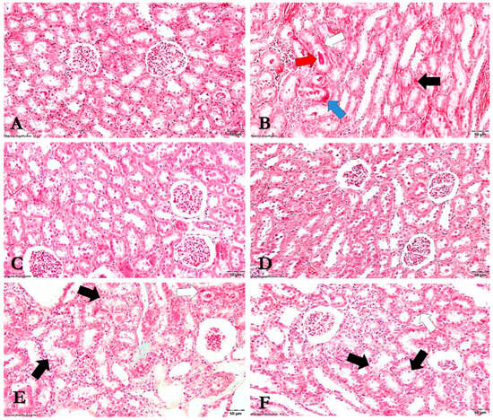 The results regarding conventional renal biomarkers showed drastic increases in BUN and creatinine levels in the gentamicin group. Following administration of both extracts, decreases in BUN levels were noted, but were not statistically significant. On the other hand, creatinine concentration substantially diminished after herbal treatment. To our current knowledge, the protective effect of Cornus mas L. extract in drug-induced nephrotoxicity in vivo has only been investigated in two previous research studies. Thus, Es Haghi et al. [] reported increases in BUN and creatinine values following carbon tetrachloride treatment, whereas the Cornus mas L. extract alleviated these changes. Another study showed significant elevations in renal biomarkers, which were reduced through the use of Cornus mas L. extract []. Moreover, due to the fact that this is the first study to our knowledge that investigates the protective advantages of Sorbus aucuparia L. extract in an in vivo nephrotoxicity trial, the renal biomarkers were contrasted to those of other herbal components with possible nephroprotective qualities. As such, substantial elevations in BUN and creatinine readings were noted following gentamicin treatment, whereas herbal therapy succeeded in reducing their concentration [,]. The non-significant reduction in BUN levels in the antibiotic and extracts-treated group in our study could be related to the necessity of providing the extracts over a longer length of time or at a larger dosage, as there is already an improvement in nephrotoxicity.