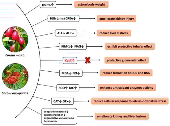Mechanistic overview of the Cornus mas L. and Sorbus aucuparia L. -mediated modulation of gentamicin-induced nephrotoxicity; non-significant—ns; CysC levels were significantly increased outlining that the extracts did not determine a protective glomerular impact—red font.