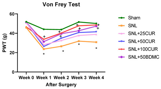 Supplementation of turmeric bioactive compounds increased mechanical thresholds in SNL rats as assessed by an electronic von Frey (VFT) aesthesiometer. Data are expressed as mean ± SEM. Six groups include Sham, SNL, SNL+25CUR (25 mg curcumin C3 complex®/BW daily), SNL+50CUR (50 mg curcumin C3 complex®/BW daily), SNL+100CUR (100 mg curcumin C3 complex®/BW daily), and SNL+50BDMC (50 mg bisdemethoxycurcumin/BW daily). n = 5–6 animals per group. At each week, data were analyzed by one-way ANOVA followed by post hoc Tukey’s test. * p < 0.05 SNL vs. Sham. + p < 0.05 SNL+100CUR vs. SNL and SNL+50BDMC vs. SNL.